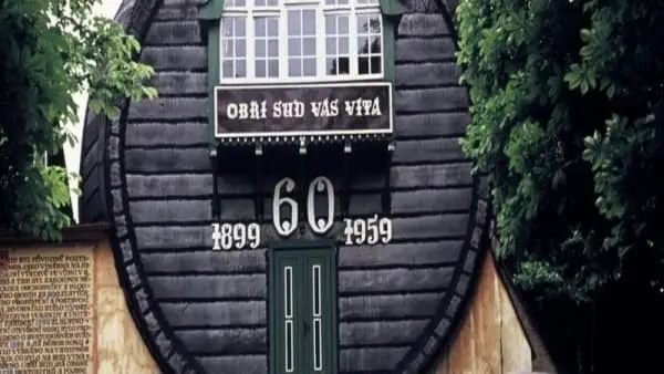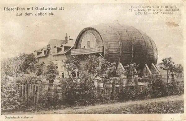V roce 1898 se ve Vídni konala Jubilejní výstava k oslavě 50 let vlády Františka Josefa I. Na výstavě byl i sud obřích rozměrů. Ten zde sloužil jako vinárna. Návštěvníkem výstavy i této vinárny byl Wilhelm Huebel, hostinský z Dlouhých Mostů u Liberce. Nápad s vinárnou v sudu se mu zalíbil natolik, že přesvědčil několik svých přátel a po skončení výstavy sud za 600 zlatých zakoupili, rozebrali a na čtyřech vagónech převezli po železnici z Vídně do Liberce. Na počátku následujícího roku bylo započato s výstavbou restaurace, jejíž součástí se stal i obří sud.
